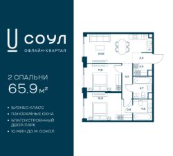 Продается 2-к. квартира номер 703 общей площадью 65.9 кв.м. на 11-м этаже 24 этажного дома, Корпус 9. С отделкой White Box Max.