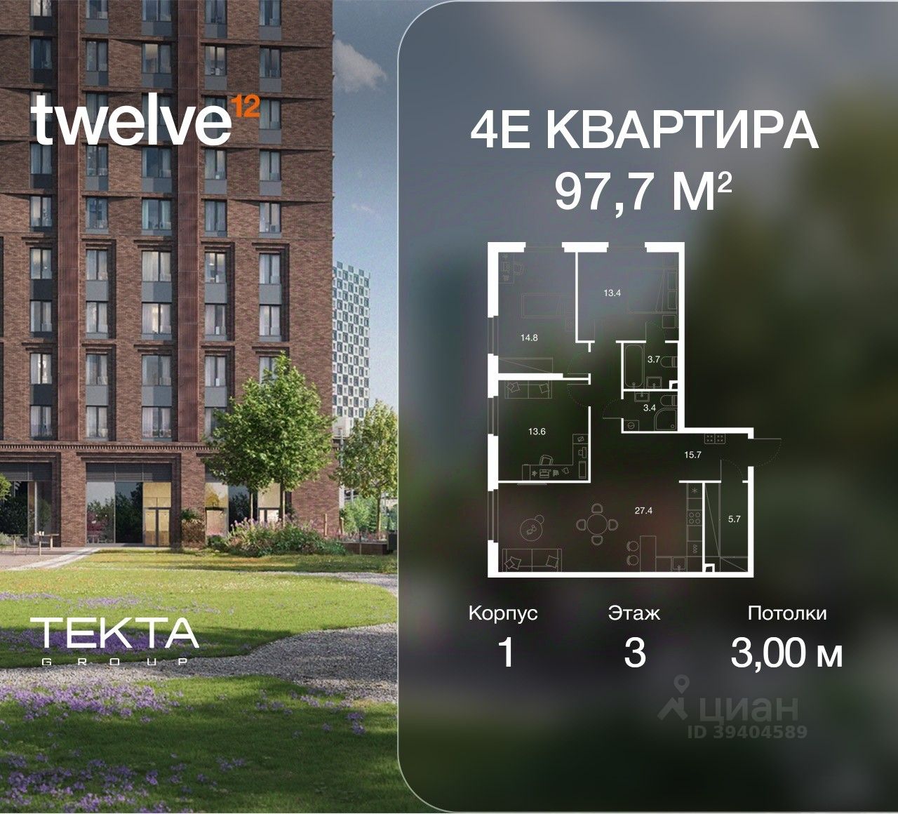 4-комн. квартира в ЖК "Twelve" на 3 этаже в 34 этажном здании Корпус 1. Общая площадь: 97.7 кв.м., жилая: 61.80 кв.м. Высота потолков 3.00 м.
