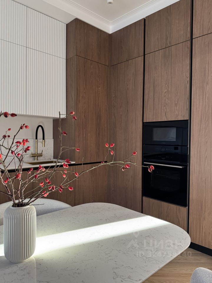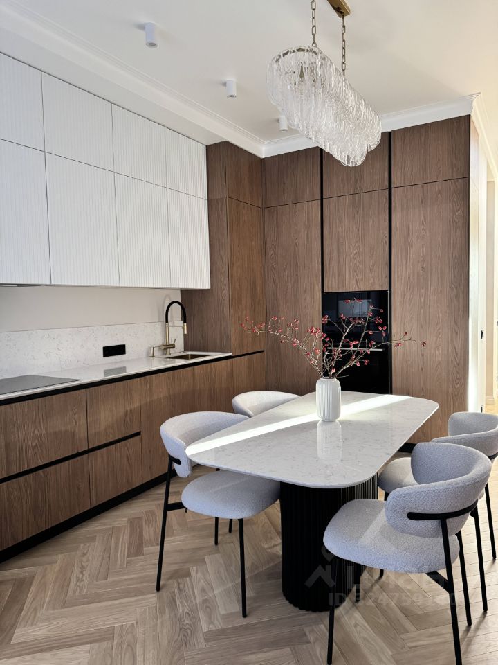 В отделке использованы только самые дорогие и экологичные материалы: инженерная доска, массивные двери, потолок из гипсокартона, столешницы/фартук/кухонный стол из натурального кварца, сантехника Bogeme, каменная ванна.