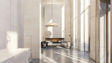 - Будучи архитектурной метафорой высокогорья, интерьер парадных лобби дома задаёт основную тему горных просторов
