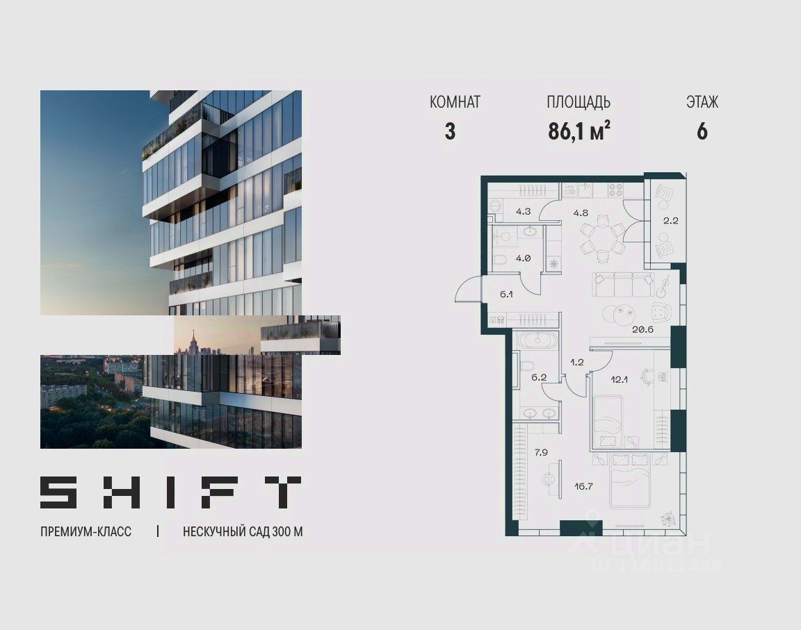 3-к квартира в премиальном комплексе SHIFT на 6-м этаже в 18 этажном здании. Общая площадь 86.1 кв. м.