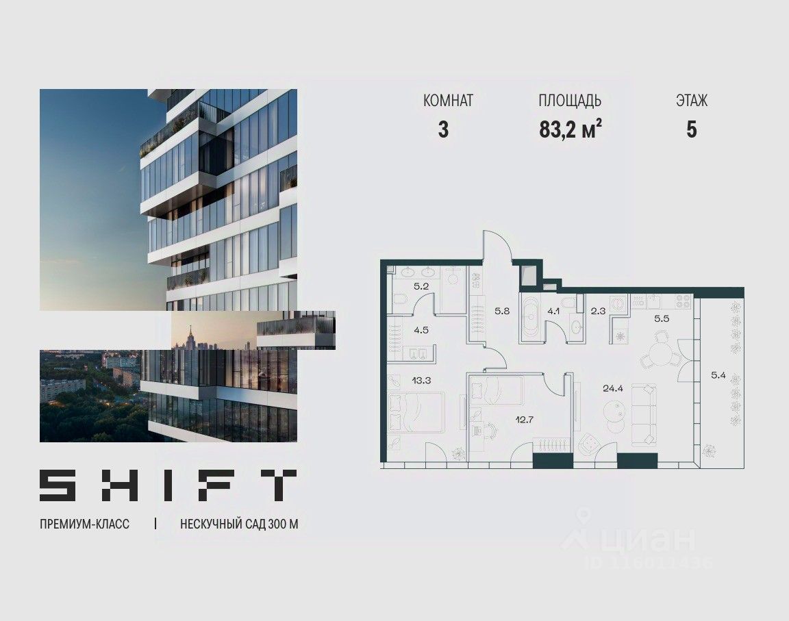 3-к квартира в премиальном комплексе SHIFT на 5-м этаже в 18 этажном здании. Общая площадь 83.2 кв. м.