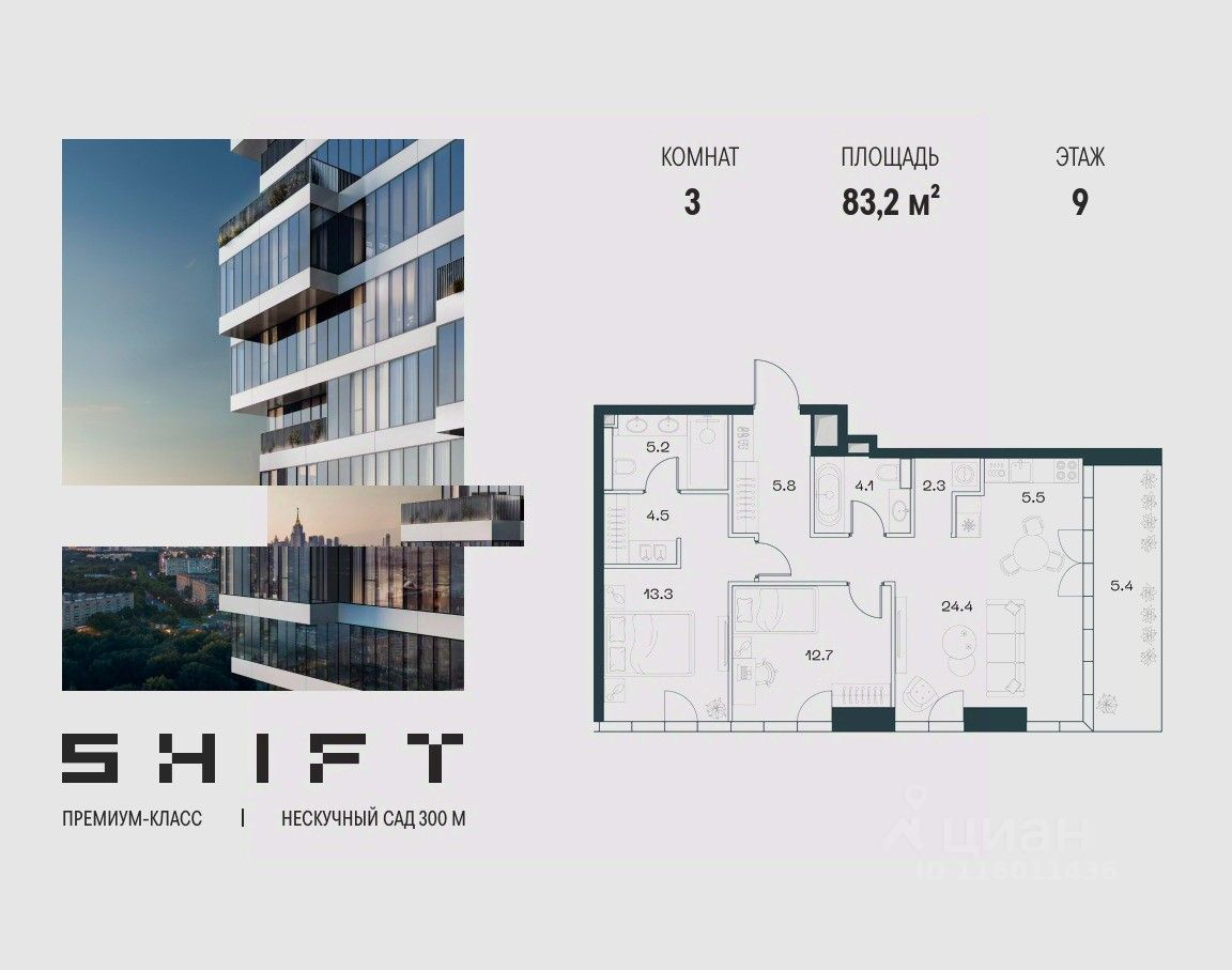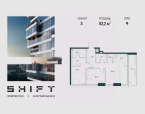 3-к квартира в премиальном комплексе SHIFT на 9-м этаже в 18 этажном здании. Общая площадь 83.2 кв. м.