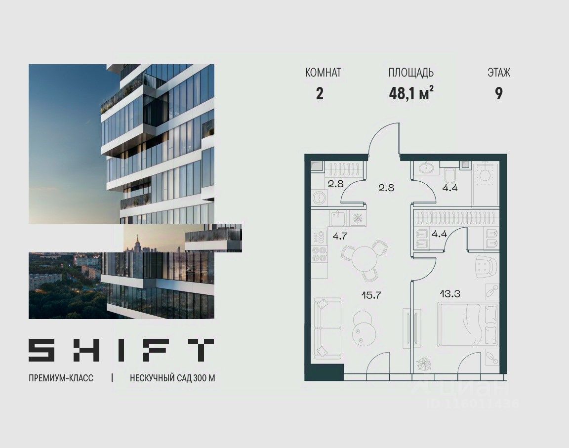 2-к квартира в премиальном комплексе SHIFT на 9-м этаже в 18 этажном здании. Общая площадь 48.1 кв. м.
