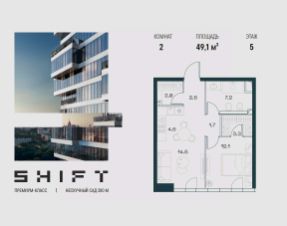 2-к квартира в премиальном комплексе SHIFT на 5-м этаже в 18 этажном здании. Общая площадь 49.1 кв. м.