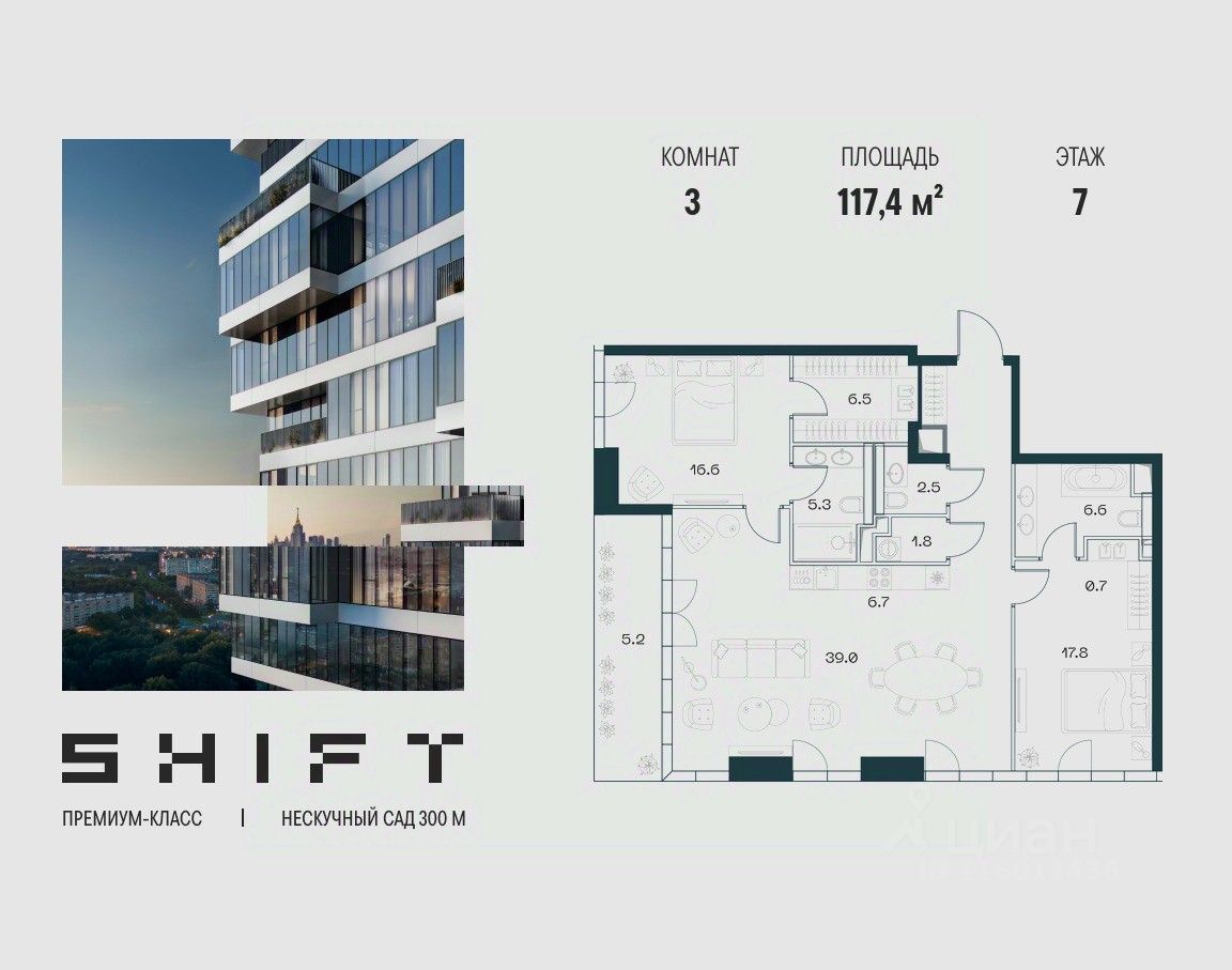 3-к квартира в премиальном комплексе SHIFT на 7-м этаже в 18 этажном здании. Общая площадь 117.4 кв. м.