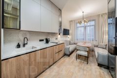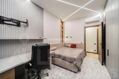 Теплые тона, продуманное освещение, встроенные системы хранения — интерьер в стиле современного комфорта.