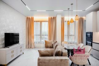Качественные отделочные материалы, дизайнерская мебель, продуманные системы хранения и световые сценарии.