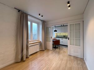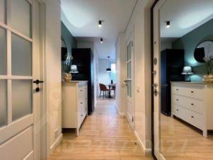 Продаётся двухкомнатная квартира с изолированными комнатами и новым дизайнерским ремонтом. Вся мебель и техника абсолютно новые и остаются в подарок покупателю! . Фото настоящие! Ремонт качественный и красивый, заходи и живи. Квартира небольшая, но с очень удобной, функциональной планировкой: кухня и две спальни, в одной из которых есть балкон и гардеробная комната. При желании можно раздвинуть раздвижные двери и получится кухня-гостиная.