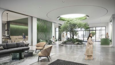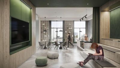 Зона отдыха и коворкинга, различные магазины, лапомойка для собак и колясочные.