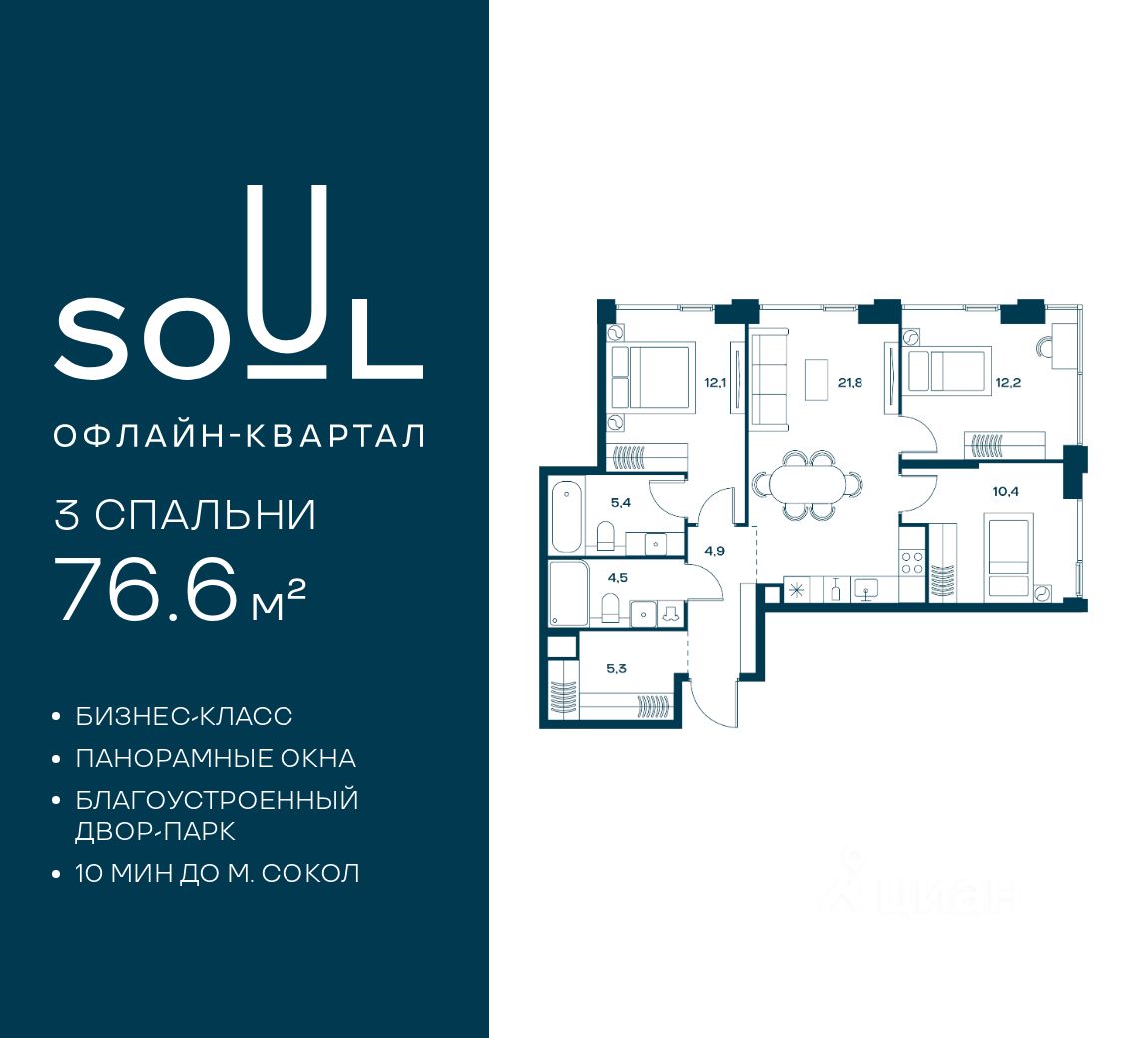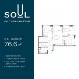 Продается 3-к. квартира номер 575 общей площадью 76.6 кв.м. на 3-м этаже 24 этажного дома, Корпус 9. С отделкой White Box Max.