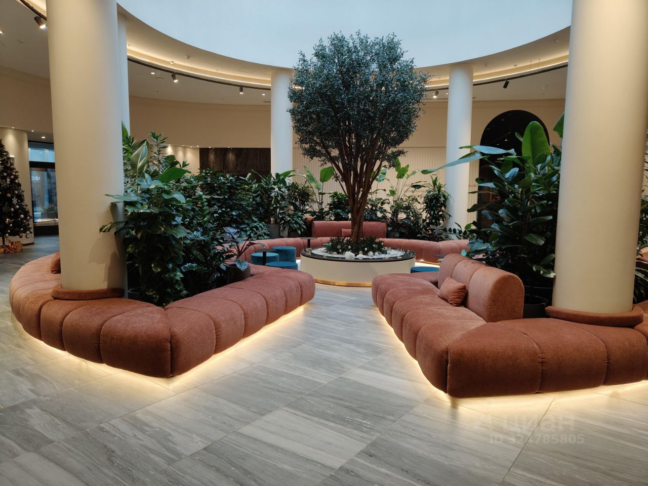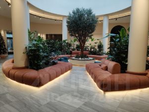 Общий холл комплекса с зимним садом, кофейней, детской игровой комнатой и помещениями для коворкинга, Ресепшен с консьержем 24/7 к услугам собственников квартир.