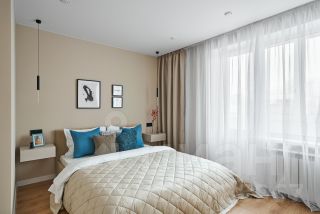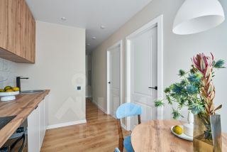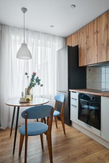 Современное дизайнерское решение выполнено в светлых с тонах, с приятными оттенками голубого, серого, дерева, а также стильными чёрными акцентами. Комфортный 8 этаж!