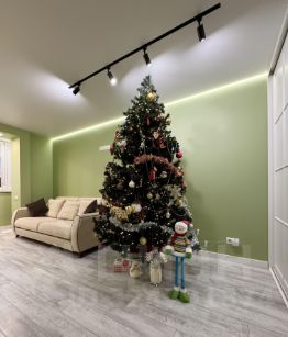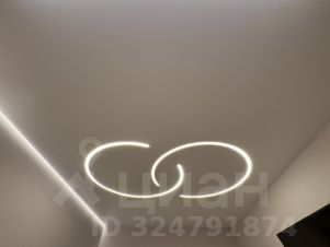В квартире разновариантная система освещения: натяжные потолки с парящим примыканием и световыми линиями (кухня, спальня, гостиная), трековое освещение в гостиной, парящие стены и пол с датчиком движения (ванная, туалет, кухня).