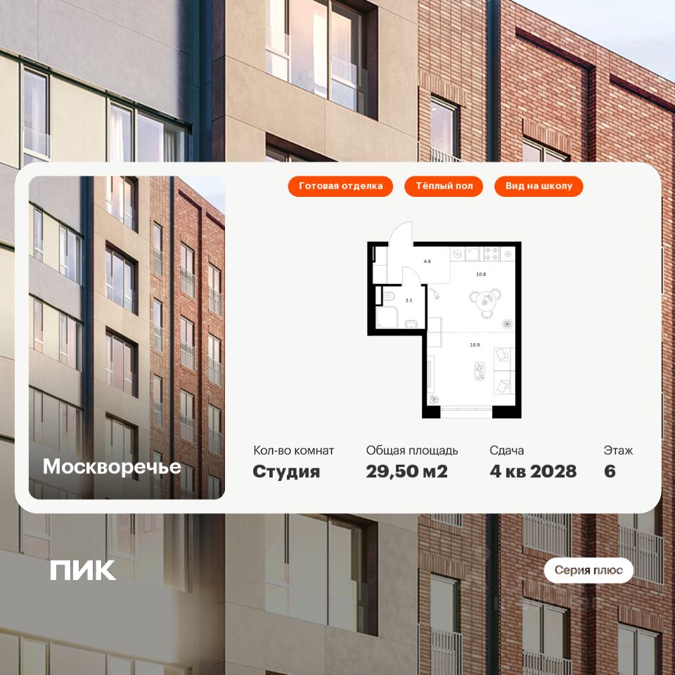 Продаётся квартира-студия площадью 29,5 кв.м на 4 этаже 12 этажного дома (Корпус 2.3, Секция 3) проекта ПИК Москворечье. Светлый просторный подъезд на уровне земли, функциональная планировка, большие окна, c отделкой.