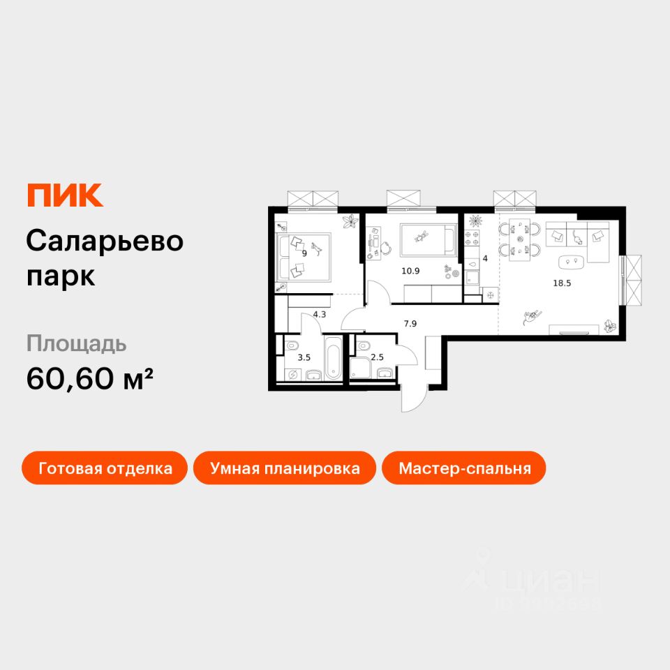 Продаётся 2-комн. квартира площадью 60,6 кв.м на 10 этаже 22 этажного дома (Корпус 56.2 , Секция 3) проекта ПИК Саларьево парк. Светлый просторный подъезд на уровне земли, функциональная планировка, большие окна, c отделкой.