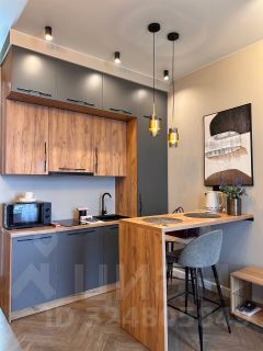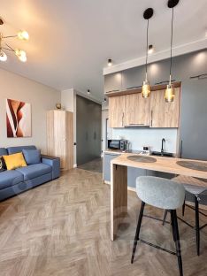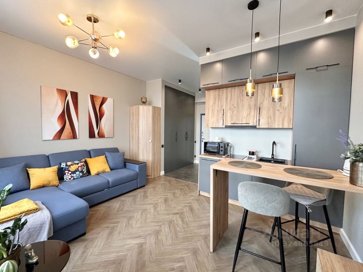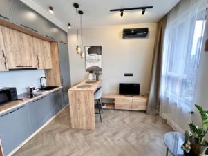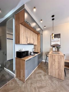 - студия с ремонтом, мебелью и всем необходимым для комфортного проживания - мягкий удобный угловой диван, телевизор, зона приготовления пищи: плита, холодильник, раковина для мытья посуды и встроенная кухонная мебель, есть места хранения.