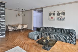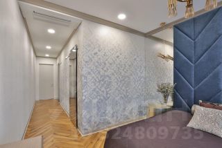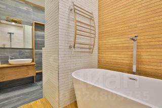 два полноценных санузла с ванной, удобные зоны хранения, коридор с зоной прихожей и гардеробной. Квартира с дизайнерскими решениями с ремонтом премиального качества, укомплектованная техникой премиального класса kupprbusch, вытяжка выезжает из-за стола и кухонный гарнитур Leight, столешница вулканический камень, потолочные кондиционеры, стиральная машинка. Мебель на заказ Италия. Гардеробные системы шведские Elfa. Жан Поль Готье шторы и обои по квартире. Шелковые обои в спальне. Полы оборудованы теплым полом, натуральными материалами.