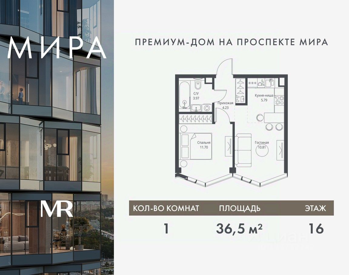 Продаётся 1-комнатная квартира общей площадью 36.50 м² без отделки в доме премиум-класса МИРА на 16-м этаже 24 этажного дома. Квартира расположена в корпусе 3.