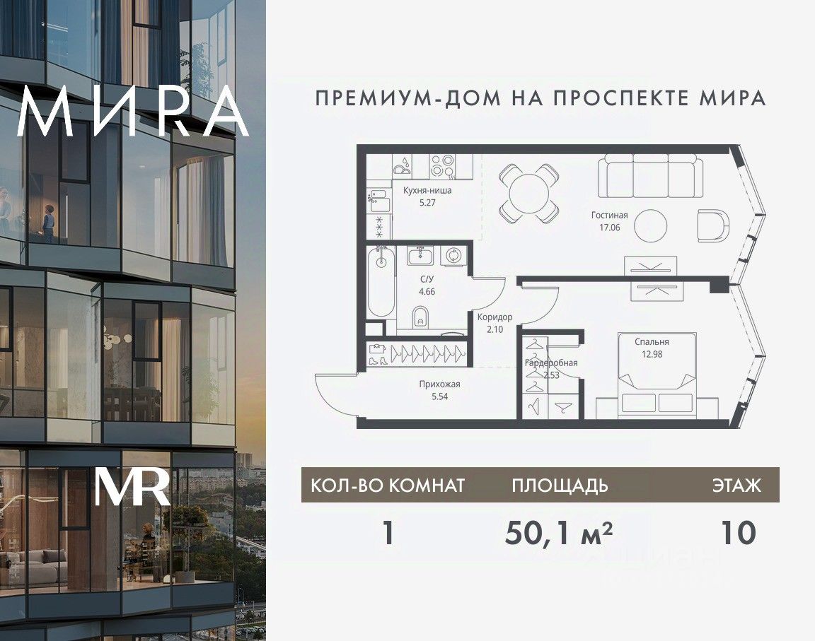 Продаётся 1-комнатная квартира общей площадью 50.14 м² без отделки в доме премиум-класса МИRА на 10-м этаже 24 этажного дома. Квартира расположена в корпусе 3.