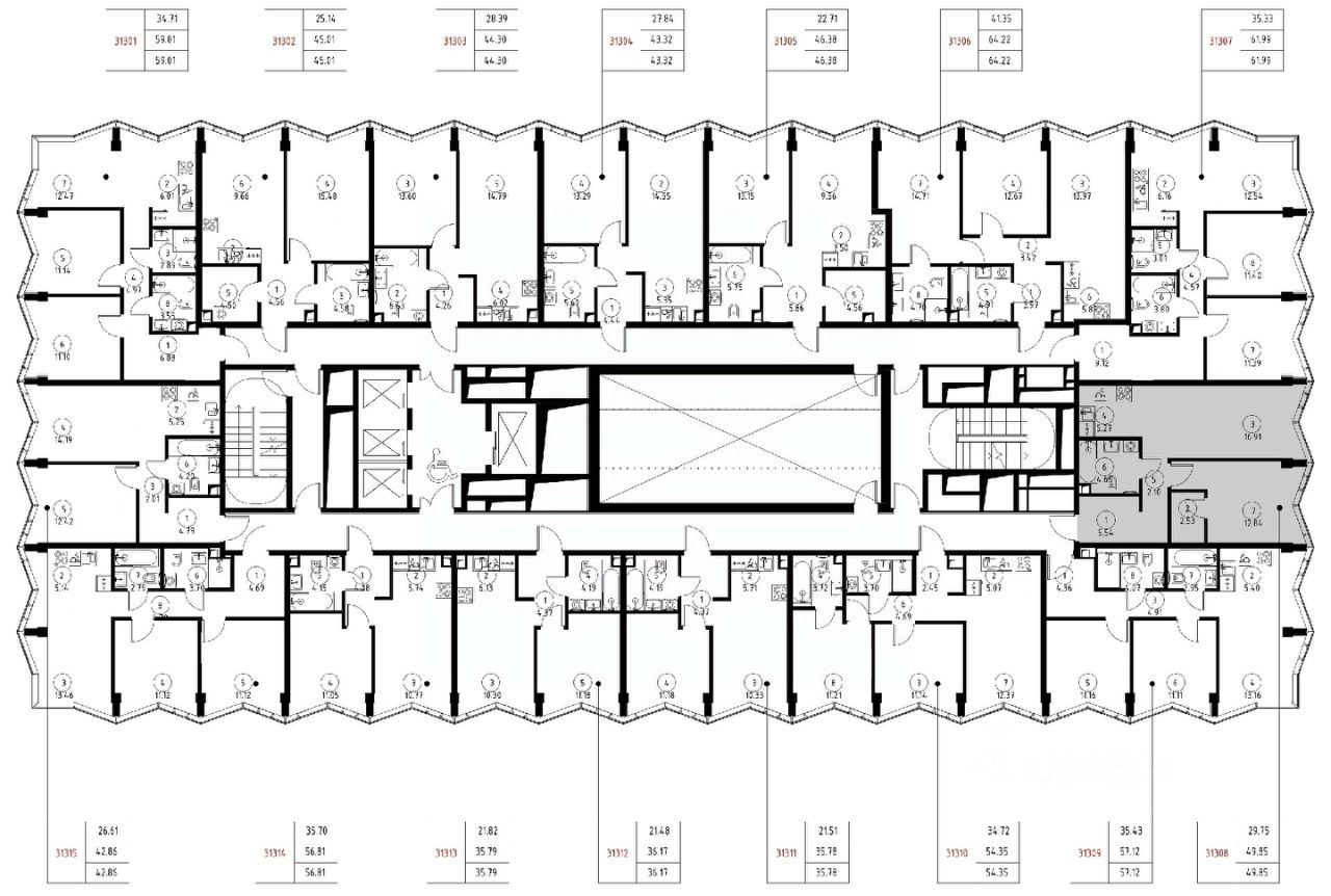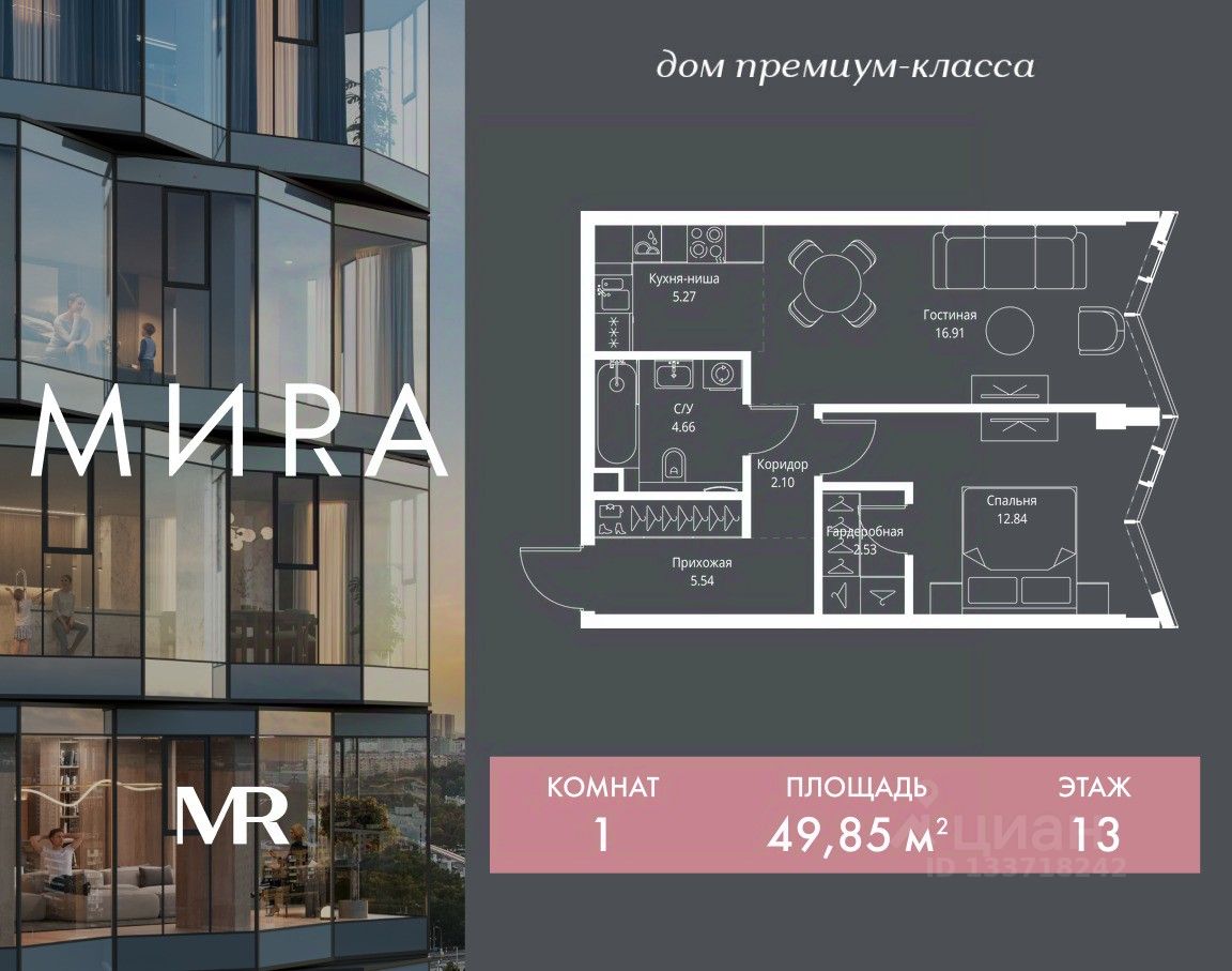Продаётся 1-комнатная квартира общей площадью 49.85 м² без отделки в доме премиум-класса МИRА на 13-м этаже 24 этажного дома. Квартира расположена в корпусе 3.