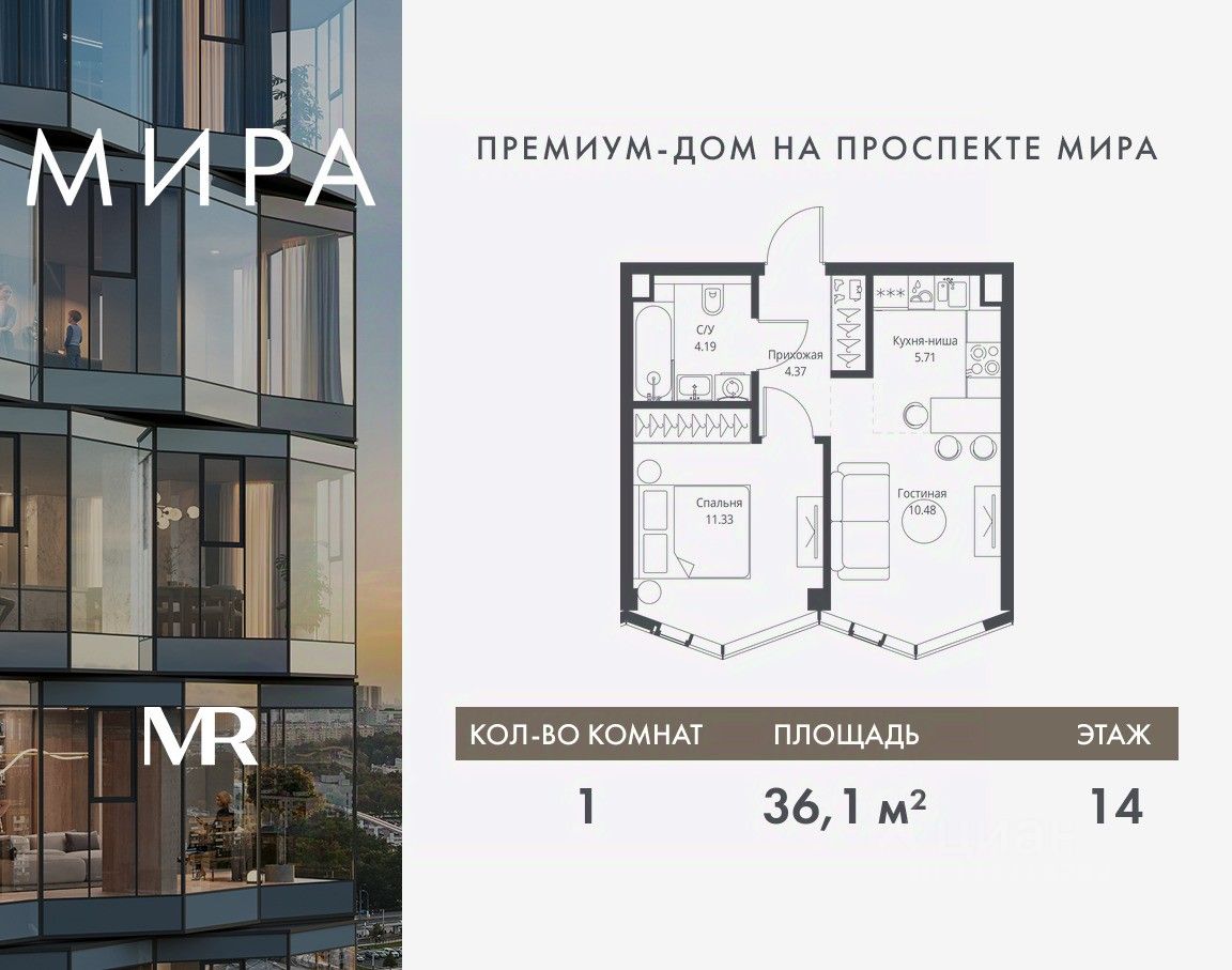 Продаётся 1-комнатная квартира общей площадью 36.08 м² без отделки в доме премиум-класса МИРА на 14-м этаже 24 этажного дома. Квартира расположена в корпусе 3.