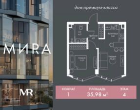 Продаётся 1-комнатная квартира общей площадью 35.98 м² без отделки в доме премиум-класса МИRА на 4-м этаже 24 этажного дома. Квартира расположена в корпусе 3.