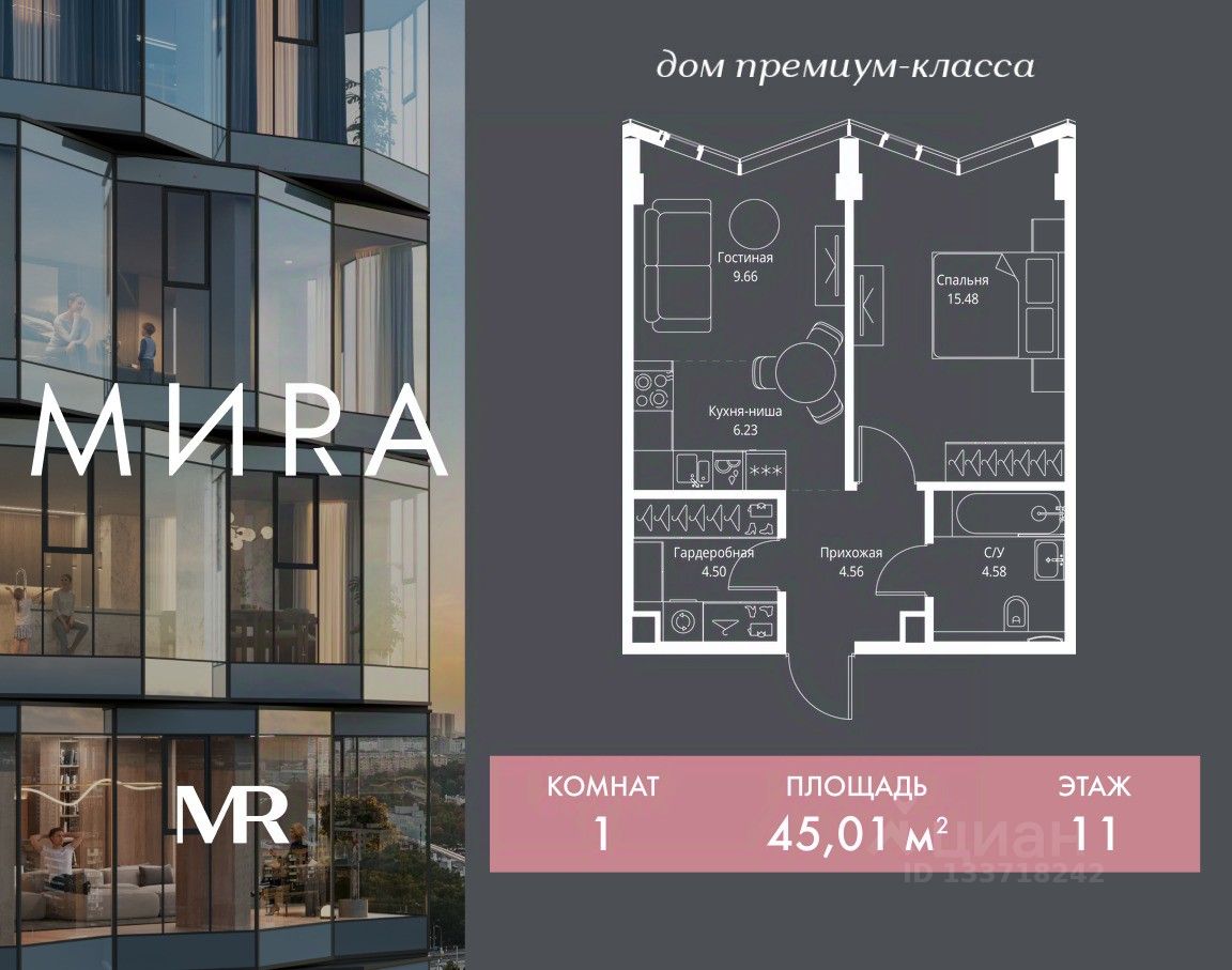 Продаётся 1-комнатная квартира общей площадью 45.01 м² без отделки в доме премиум-класса МИRА на 11-м этаже 24 этажного дома. Квартира расположена в корпусе 3.