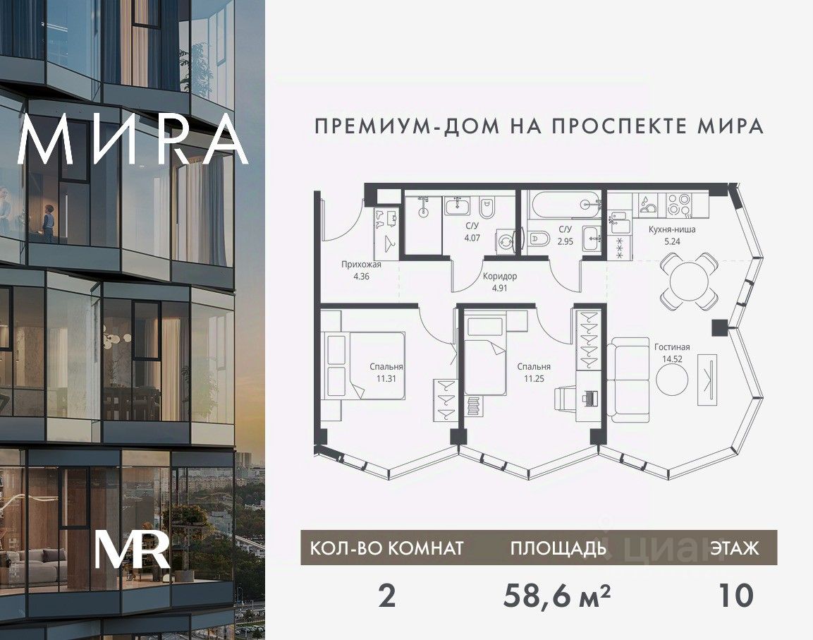 Продаётся 2-комнатная квартира общей площадью 58.61 м² без отделки в доме премиум-класса МИRА на 10-м этаже 24 этажного дома. Квартира расположена в корпусе 3.