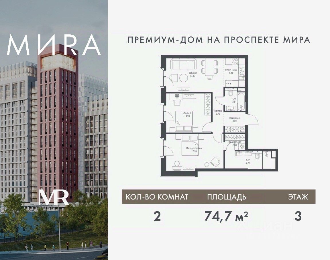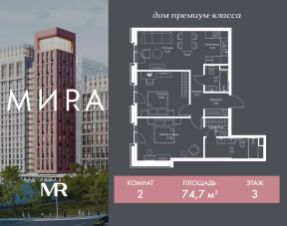 Продаётся 2-комнатная квартира общей площадью 74.70 м² без отделки в доме премиум-класса МИRА на 3-м этаже 23 этажного дома. Квартира расположена в корпусе 2.