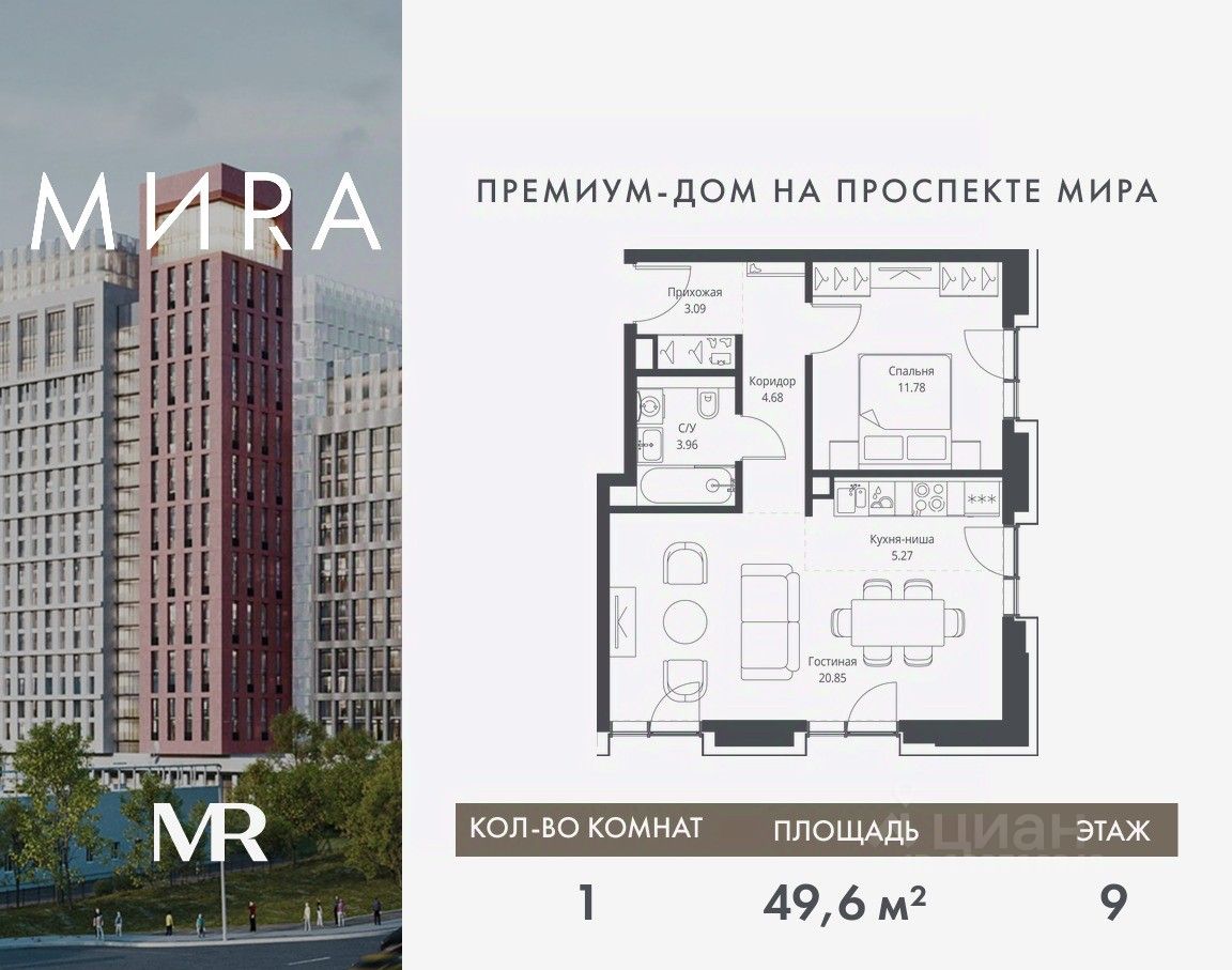 Продаётся 1-комнатная квартира общей площадью 49.63 м² без отделки в доме премиум-класса МИRА на 9-м этаже 23 этажного дома. Квартира расположена в корпусе 2.