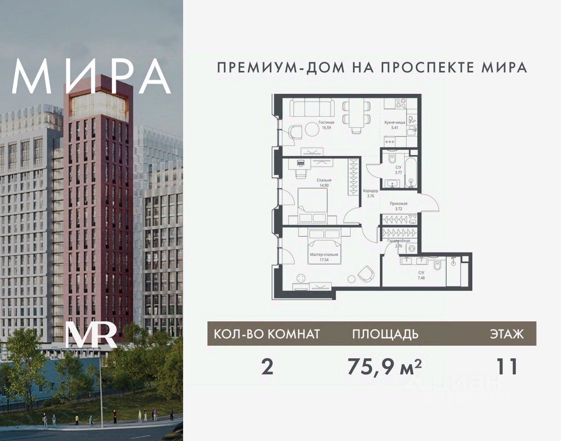 Продаётся 2-комнатная квартира общей площадью 75.93 м² без отделки в доме премиум-класса МИРА на 11-м этаже 23 этажного дома. Квартира расположена в корпусе 2.
