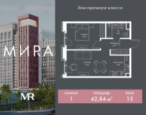 Продаётся 1-комнатная квартира общей площадью 42.84 м² без отделки в доме премиум-класса МИRА на 15-м этаже 23 этажного дома. Квартира расположена в корпусе 2.