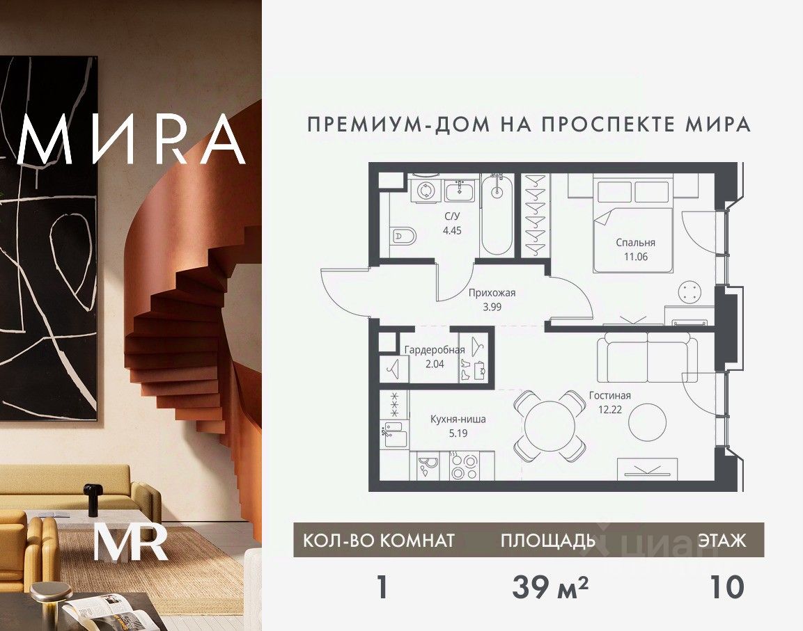 Продаётся 1-комнатная квартира общей площадью 38.95 м² без отделки в доме премиум-класса МИRА на 10-м этаже 23 этажного дома. Квартира расположена в корпусе 2.
