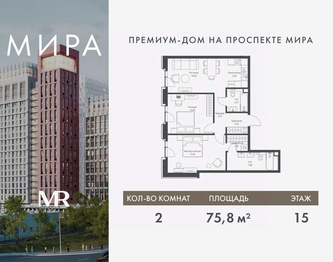 Продаётся 2-комнатная квартира общей площадью 75.75 м² без отделки в доме премиум-класса МИРА на 15-м этаже 23 этажного дома. Квартира расположена в корпусе 2.