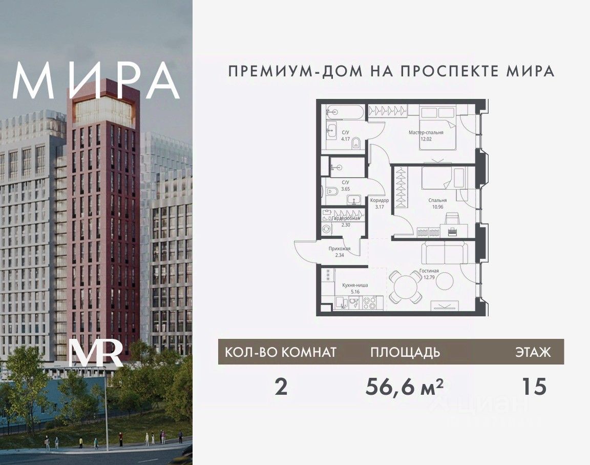 Продаётся 2-комнатная квартира общей площадью 56.56 м² без отделки в доме премиум-класса МИРА на 15-м этаже 23 этажного дома. Квартира расположена в корпусе 2.