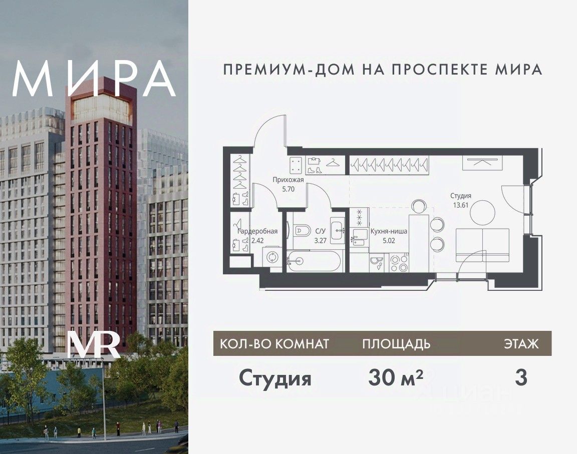 Продаётся студия общей площадью 30.02 м² без отделки в доме премиум-класса МИРА на 3-м этаже 23 этажного дома. Квартира расположена в корпусе 2.