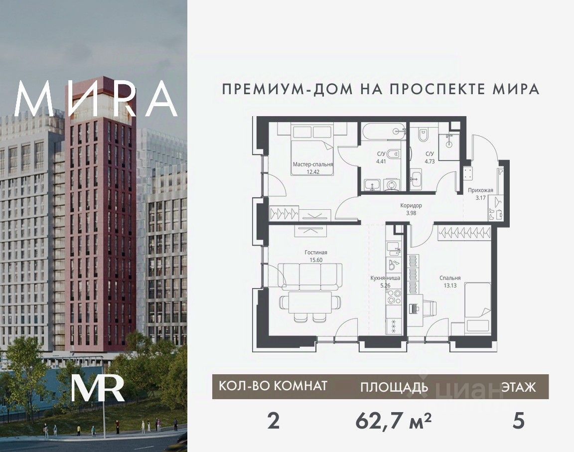 Продаётся 2-комнатная квартира общей площадью 62.70 м² без отделки в доме премиум-класса МИRА на 5-м этаже 23 этажного дома. Квартира расположена в корпусе 2.