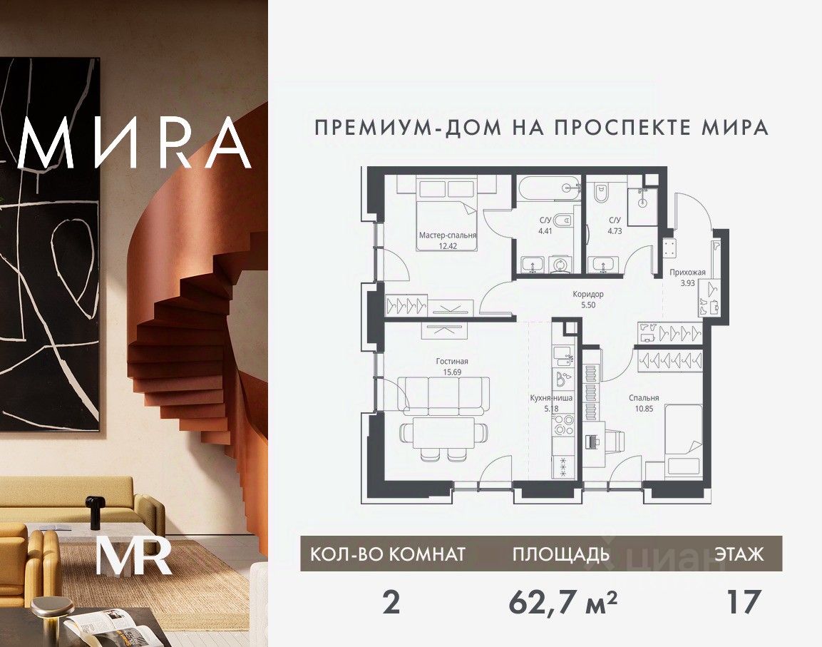 Продаётся 2-комнатная квартира общей площадью 62.71 м² без отделки в доме премиум-класса МИRА на 17-м этаже 23 этажного дома. Квартира расположена в корпусе 2.