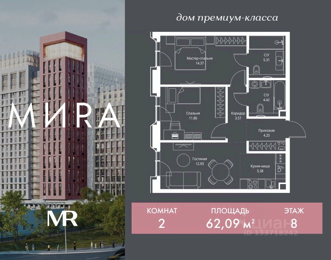 Продаётся 2-комнатная квартира общей площадью 62.09 м² без отделки в доме премиум-класса МИRА на 8-м этаже 23 этажного дома. Квартира расположена в корпусе 2.
