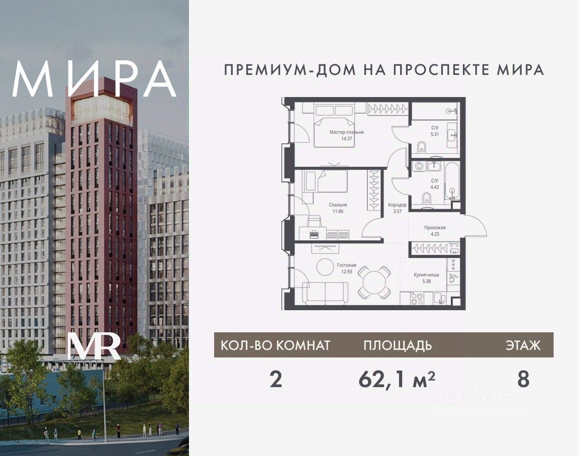 Продаётся 2-комнатная квартира общей площадью 62.09 м² без отделки в доме премиум-класса МИРА на 8-м этаже 23 этажного дома. Квартира расположена в корпусе 2.