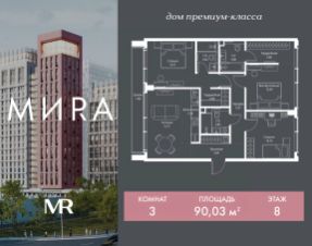Продаётся 3-комнатная квартира общей площадью 90.03 м² без отделки в доме премиум-класса МИRА на 8-м этаже 23 этажного дома. Квартира расположена в корпусе 2.