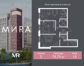 Продаётся 2-комнатная квартира общей площадью 75.75 м² без отделки в доме премиум-класса МИRА на 13-м этаже 23 этажного дома. Квартира расположена в корпусе 2.