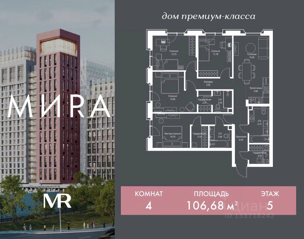 Продаётся 4-комнатная квартира общей площадью 106.68 м² без отделки в доме премиум-класса МИRА на 5-м этаже 23 этажного дома. Квартира расположена в корпусе 2.