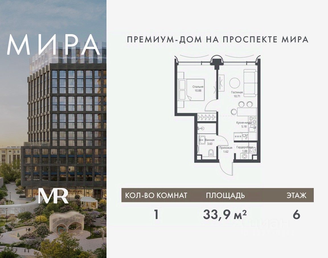 Продаётся 1-комнатная квартира общей площадью 33.87 м² без отделки в доме премиум-класса МИРА на 6-м этаже 17 этажного дома. Квартира расположена в корпусе 1.
