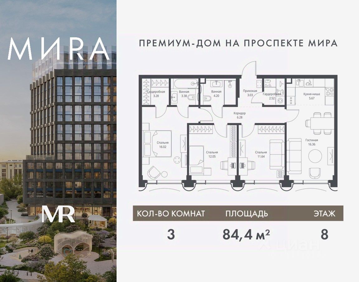 Продаётся 3-комнатная квартира общей площадью 84.43 м² без отделки в доме премиум-класса МИRА на 8-м этаже 17 этажного дома. Квартира расположена в корпусе 1.