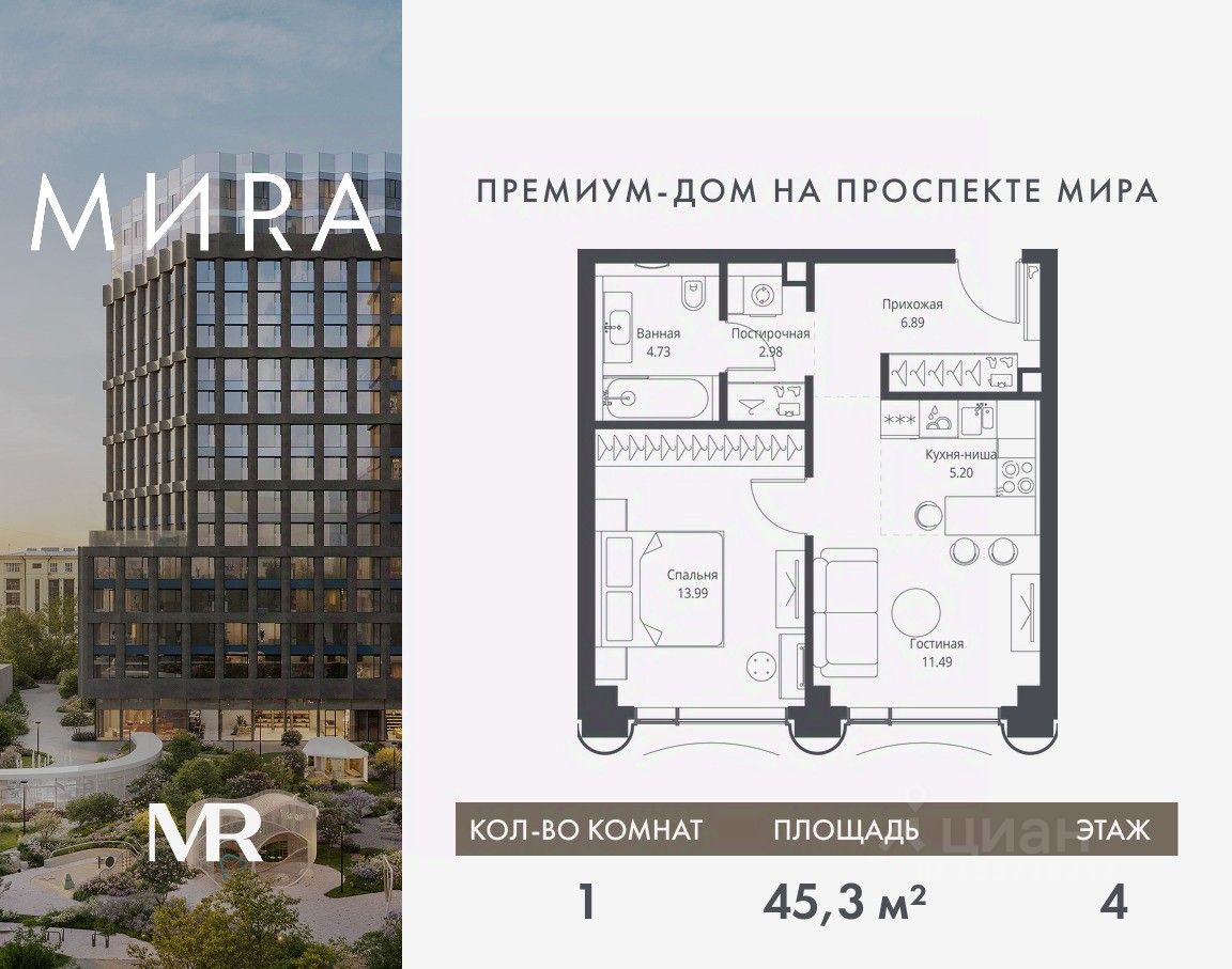 Продаётся 1-комнатная квартира общей площадью 45.28 м² без отделки в доме премиум-класса МИRА на 4-м этаже 17 этажного дома. Квартира расположена в корпусе 1.