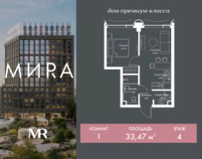 Продаётся 1-комнатная квартира общей площадью 33.47 м² без отделки в доме премиум-класса МИRА на 4-м этаже 17 этажного дома. Квартира расположена в корпусе 1.
