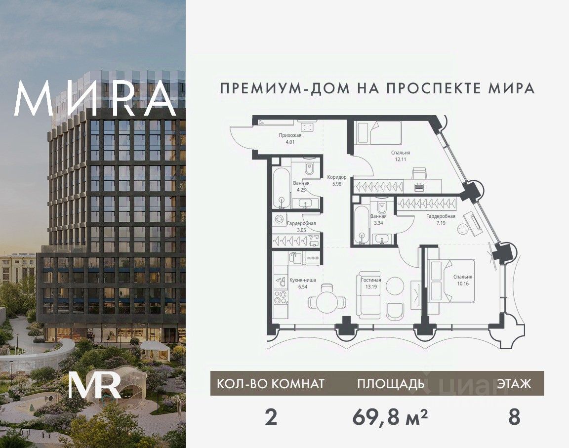 Продаётся 2-комнатная квартира общей площадью 69.82 м² без отделки в доме премиум-класса МИRА на 8-м этаже 17 этажного дома. Квартира расположена в корпусе 1.