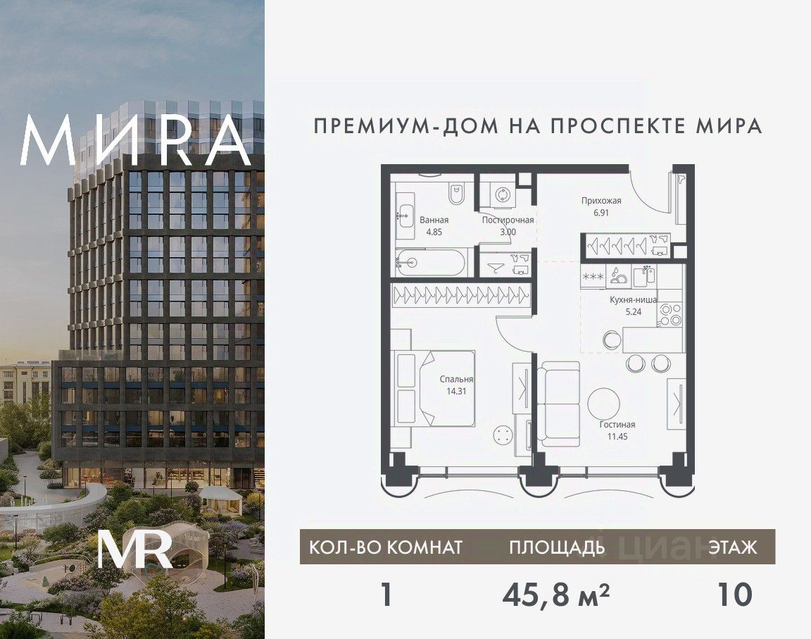 Продаётся 1-комнатная квартира общей площадью 45.76 м² без отделки в доме премиум-класса МИRА на 10-м этаже 17 этажного дома. Квартира расположена в корпусе 1.